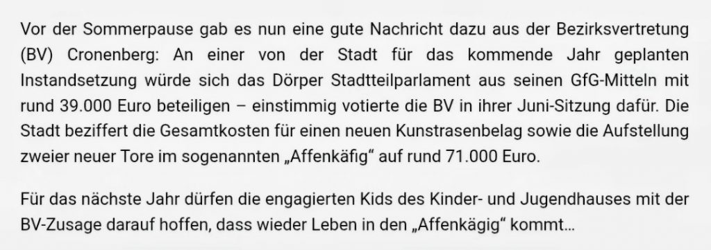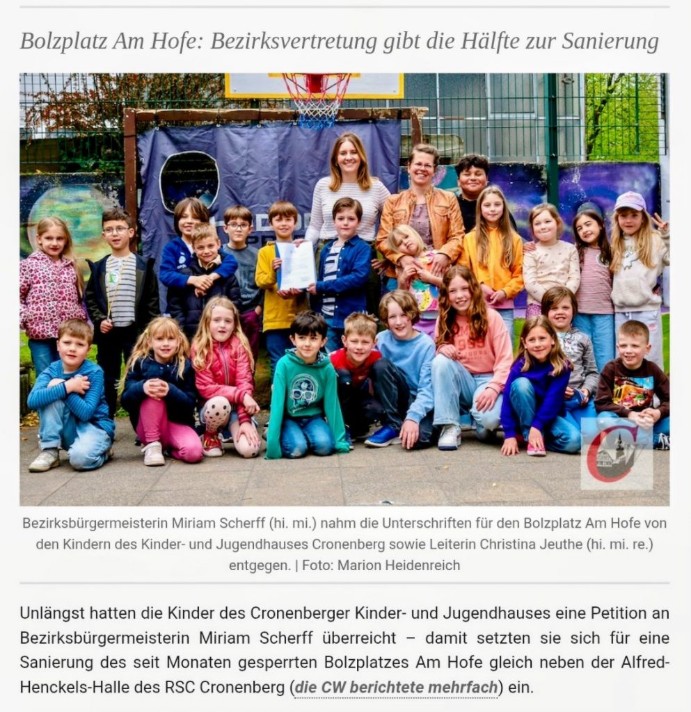 UPDATE: Was für eine tolle Info zum Start in die Ferien: Die Bezirksvertretung hat sich einstimmig dafür entschieden sich mit 39.000€ an der Sanierung des Bolzplatzes zu beteiligen! Was für ein tolles Signal an die mutigen und beharrlichen Kinder aus Cronenberg!!!
