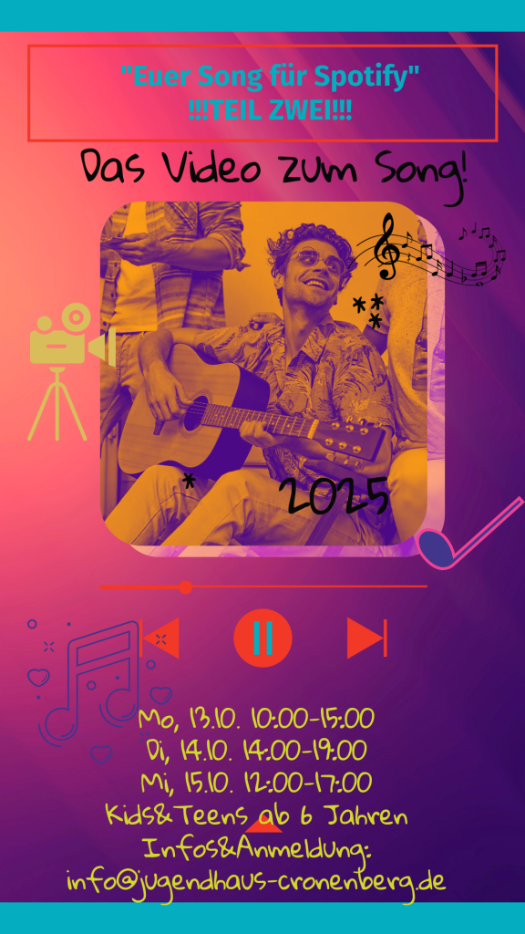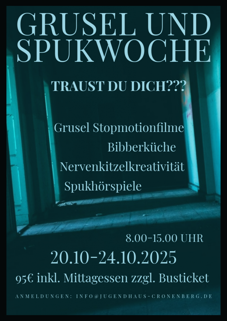 Als Warm-Up findet ein Videodreh zum Cronenberg-Song statt. Traut Euch vor die Kamera für euer Dorf (anmeldungen unter info@jugendhaus-cronenberg.de)! Außerdem wird eine Grusel- und Spukwoche stattfinden (dafür sind leider keine Anmeldungen mehr möglich!)