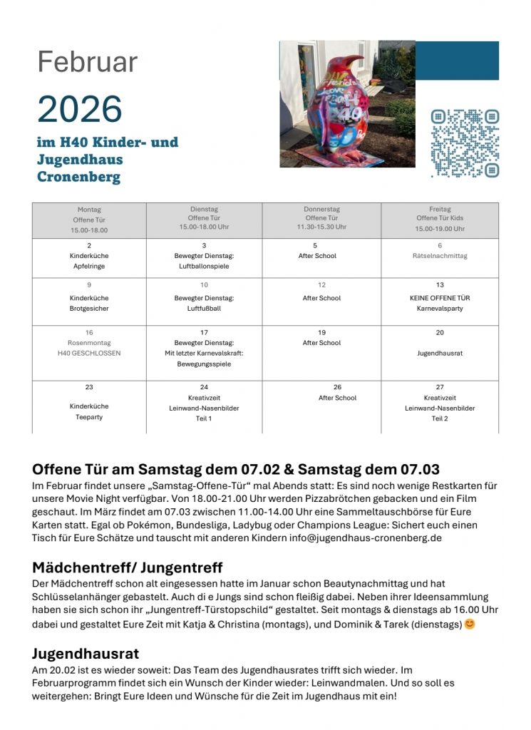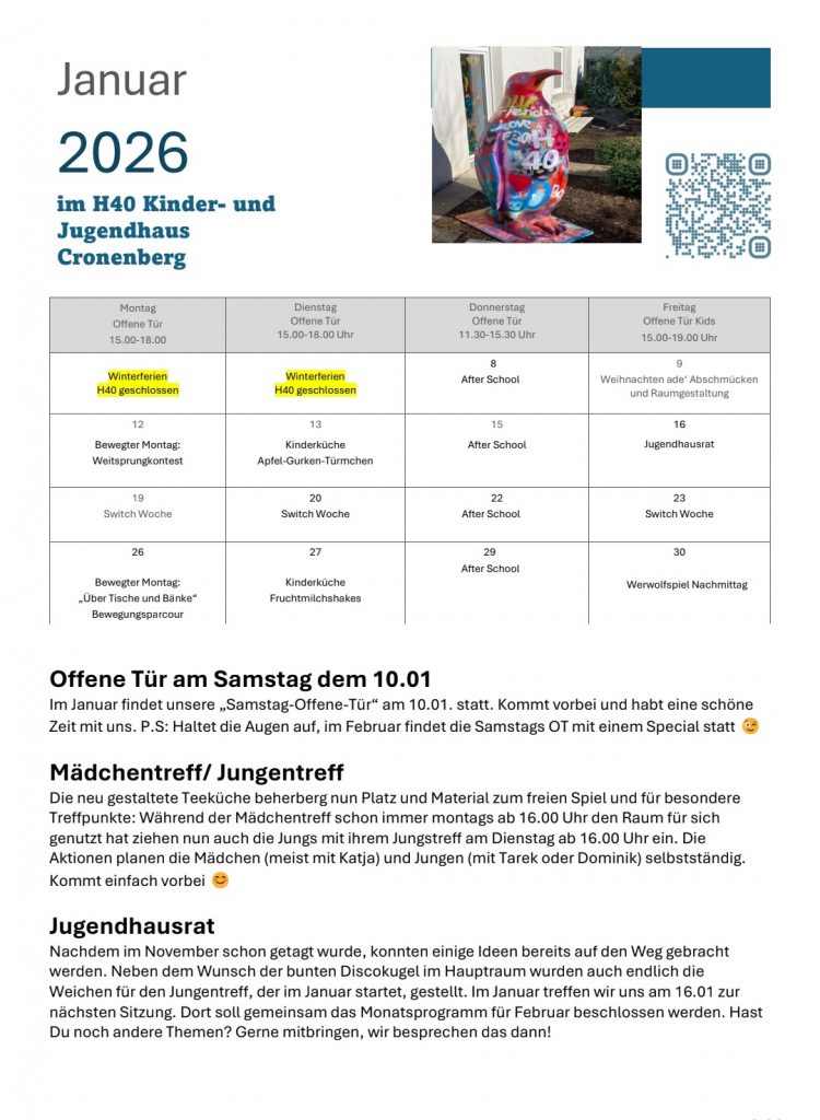 Anstelle unseres Monatsprogrammes laden wir Euch im Dezember zu vielen kleinen Überraschungen im H-40 Adventskalender ein. Kommt zu den bekannten Zeiten vorbei und genießt mit uns die Vorweihnachtszeit!