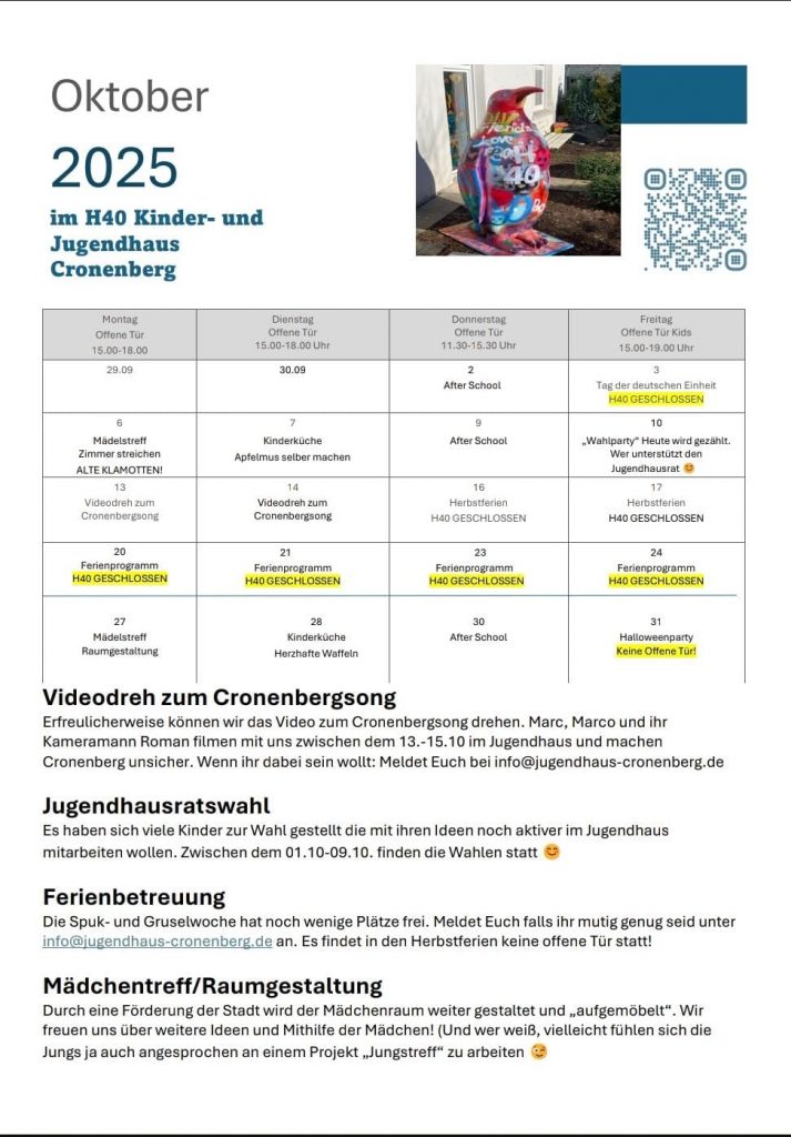 Anstelle unseres Monatsprogrammes laden wir Euch im Dezember zu vielen kleinen Überraschungen im H-40 Adventskalender ein. Kommt zu den bekannten Zeiten vorbei und genießt mit uns die Vorweihnachtszeit!